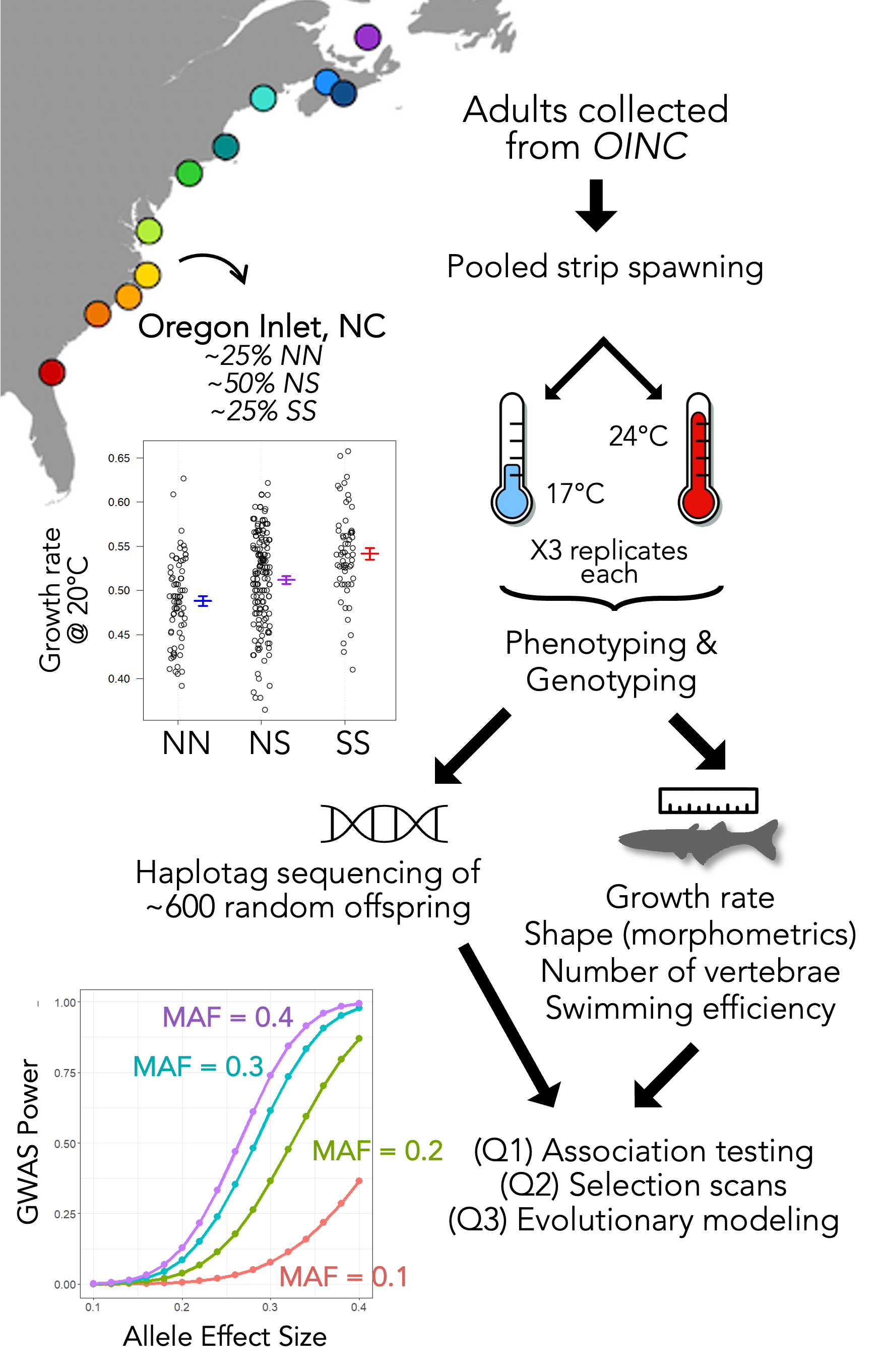 As a continuation of Jessi’s NSF Postdoctoral Fellowship working with Nina Overgaard Therkildsen at Cornell University and Hannes Baumann at University of Conneticuit-Avery Point, we are investigating the evolutionary mechanisms that facilitate local adaptation via chromosomal inversions in the Atlantic silverside study system, using a combination of common garden experiments, genomic investigations, and simulation studies.