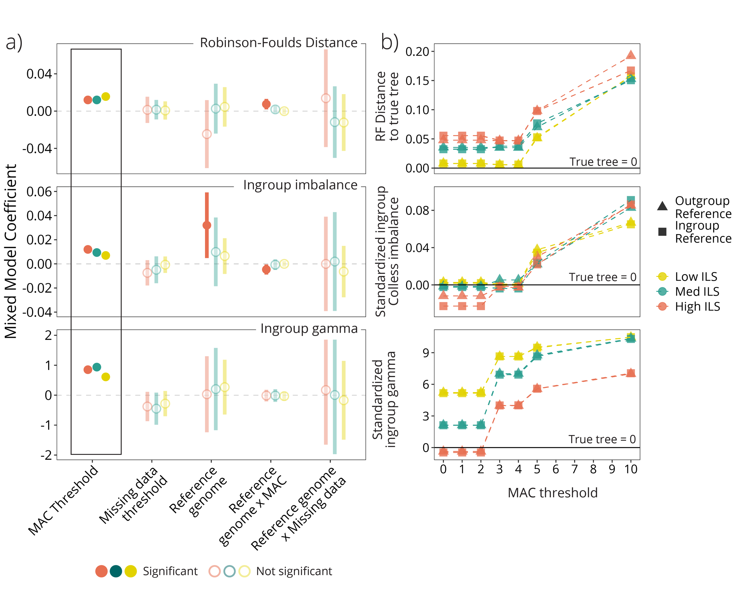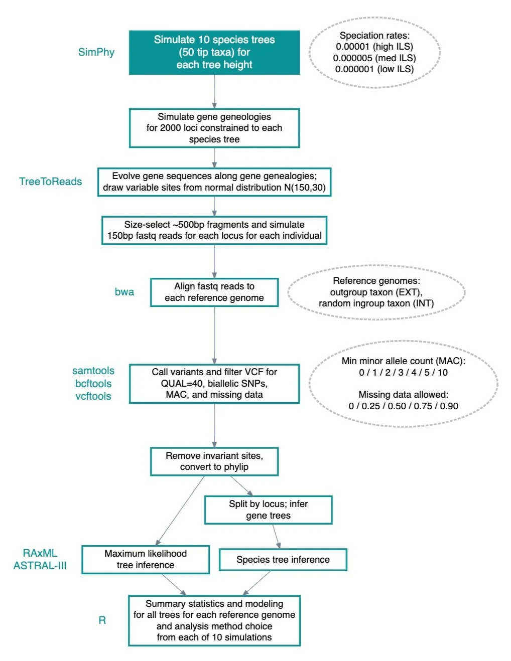 Analysis of genomic data requires researchers to make a priori decisions on which data to retain and which to filter out, which can introduce biases into the data used in analyses. It is important to understand biases introduced by these data processing steps, which can substantially affect subsequent analyses. There has been little investigation into biases introduced by the choice of which reference genome(s) to use for aligning reads when using reduced-representation or whole genome resequencing data, yet these early steps may substantially alter inferences by systematically biasing which genetic loci are retained after processing. Together with Dr. Chad Brock, we are using simulations to investigate the effects of the distance from a reference genome to the in-group taxa (i.e., whether the reference genome is an in- or outgroup individual) and the manner in which this interacts with bioinformatic filtering choices made before analysis even begins in earnest.