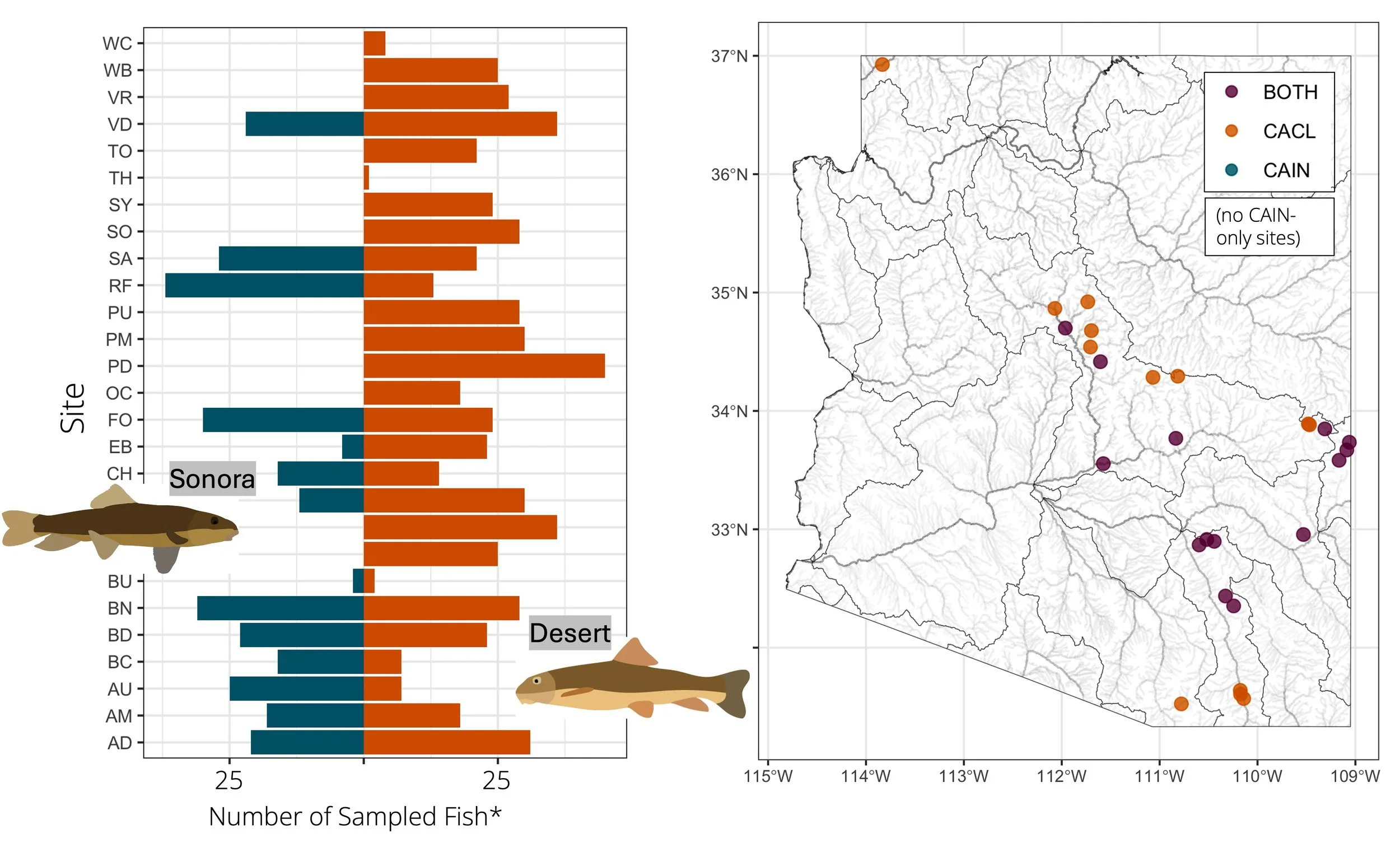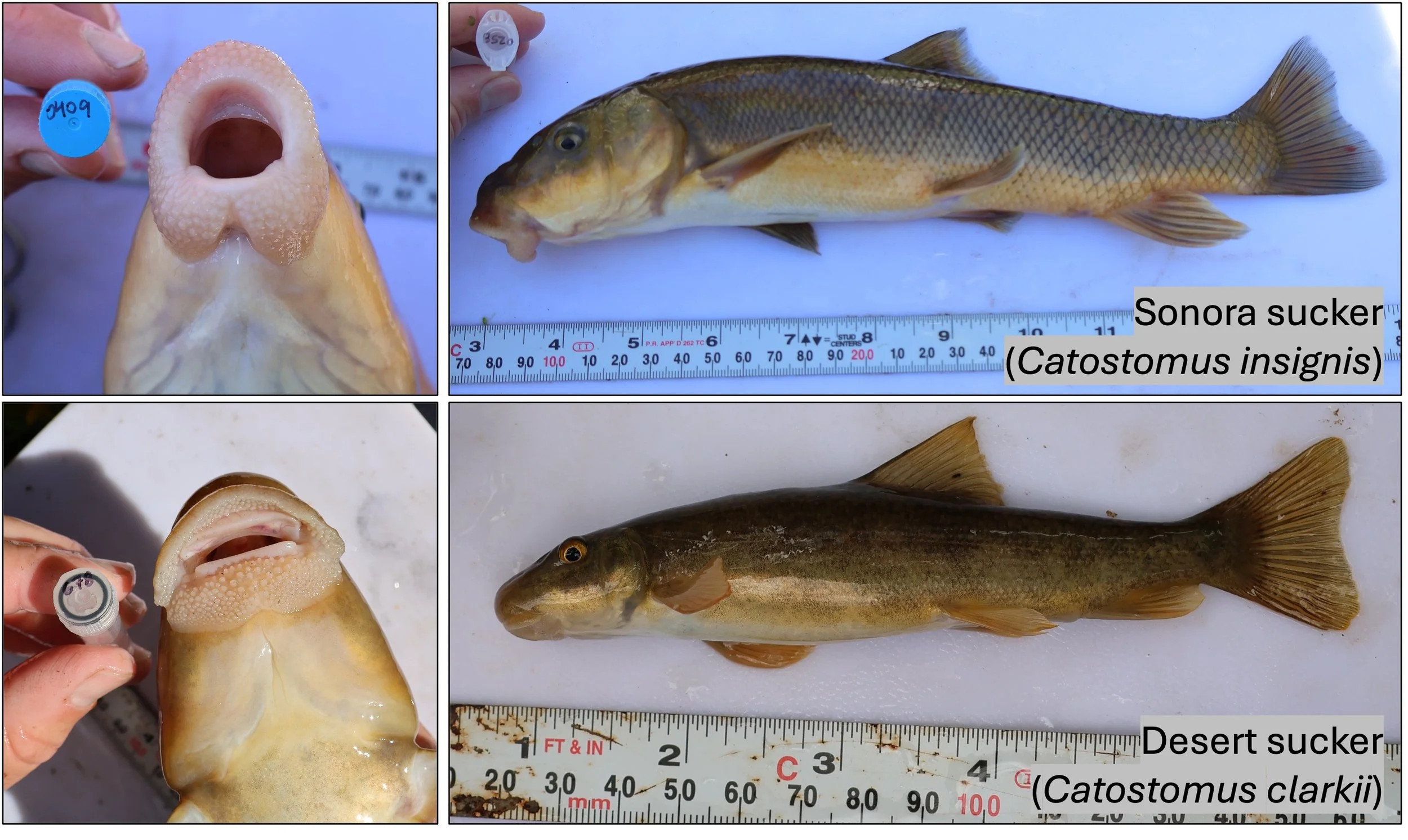 We are conducting a genomic study to understand the relationships among populations of desert suckers (Catostomus clarkii), Sonora suckers (Catostomus insignis), and their hybrids, seeking to understand (1) genetic connectivity among populations of desert sucker, (2) genetic connectivity among populations of Sonora sucker, (3) the rate of hybridization among the two species in streams where they co-occur, and (4) spatial variation in the rates of hybridization among the two species, and how this variation relates to stream characteristics (including anthropogenic influences) and ecological outcomes of hybridization.