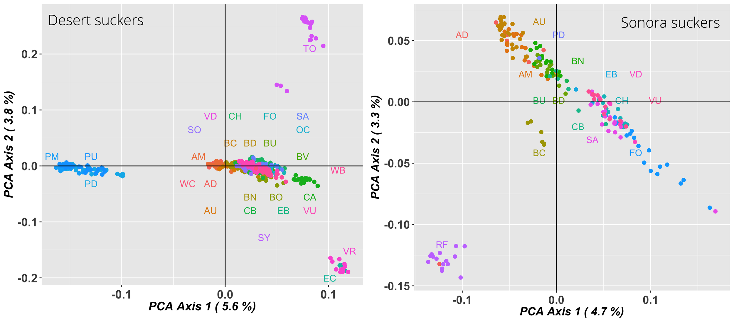 First-pass principal components analysis of the Desert sucker (left) and Sonora sucker (right) individuals that were sampled during the 2024 field season. Each point represents one individual fish, points are colored by the sampling location, and two-letter location codes are used to label each sampling location. Dots that are close to one another on the plot are individual fish that are closely related to one another genetically, while dots farther apart are fish that are less similar genetically.
